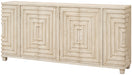 The District 6-Door Console in a grey wash finish is a striking blend of modern elegance and artisanal craftsmanship. Featuring intricate geometric paneling on its doors, this spacious console offers both style and functionality, making it a perfect statement piece for any living or dining space.