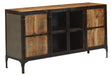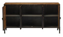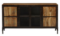 The frame of this "warm industrial" plasma is constructed, using MIG welding joint methods, of black powder coated cast iron. Features include panels in both sheet metal and a combination of new and reclaimed woods in our water-resistant lacquer sealed rustic Sawan finish-iron door stops and hardware and a center section with MESH.