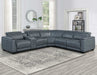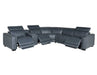 Clean Euro-modern styling with the looks of a stationary Sectional, Lorenzo sets the tone with a neutral grey leather cover over ultra-clean lines. But the real beauty of the show is the comfort in this wide, deep-seated gem. Power footrest and a power articulating headrest ensure you have the perfect seat in the house. And when finished, all close button returns the footrest and headrest to the original position. Measures 106' by 96" wide and is modular.