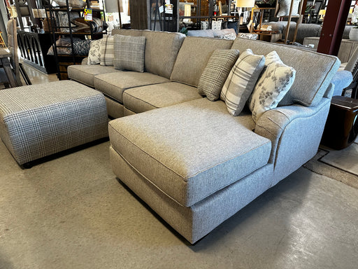 Corinthian$1,499.00| /USA made with amazing quality and craftsmanship. All accent pillows included. Covered with an oatmeal-colored polyester fabric. 2pc Sectional- 3...