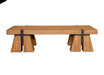 The Leonidas Coffee Table showcases a rugged yet refined design, featuring a thick wooden slab top supported by bold, geometric pedestal bases with metal accents. Its rustic finish and solid construction make it a striking centerpiece for any living space.