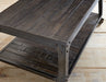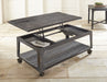 Sherlock presents rustic industrial styling in a lift-top cocktail set that will bring function to your living room tables. The highly distressed top and base of the tables give interesting character to the table while the metal structure adds an interesting mixed media component to the group. Four large locking casters give the Cocktail added mobility which pairs well with the matching End Table.