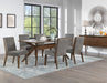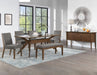 Transform your dining room into a Mid-Century Modern oasis with the Quinn 6-piece dining set, Unique curved angles are crafted from top-quality oak veneers and Asian hardwood solids and hand-stained in a chestnut finish that warms a room in classic Mid-Century style. The 71-inch table centers the room and comfortably seats six people, making it the perfect choice for hosting dinner parties, family gatherings, or casual meals with loved ones.