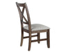 This solid wood dining chair has a mix of distressed wood and leatherette that fits the bill for your rustic dining area. Crafted from Rubberwood solids in a warm Mocha finish, the chair is upholstered in an oatmeal leatherette that is easy to match. The Criss-cross back silhouette is shaped for comfort and combines with tapered legs to add a level of refinement that enhances the rustic style of the chair. A foam-filled seat adds support and makes sure guests stay for the conversation after the meal.