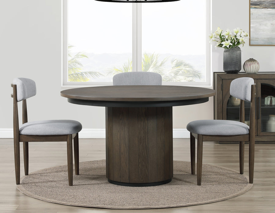 The Burlington 52-inch Round Table in mocha forms a centerpiece that marries elegance with style. The table features a sturdy circular base, providing a strong foundation while offering ample clearance for chairs. Its unique polygonal circle design is highlighted by a striking black accent on the apron and base that seamlessly elevates the ebony finish to create a cohesive and luxurious look. Designed to comfortably seat up to six people, the Burlington Table is ideal for fostering a cozy and intimate atmosphere, perfect for close-knit gatherings and engaging conversations. Five pc set includes tables and four chairs.