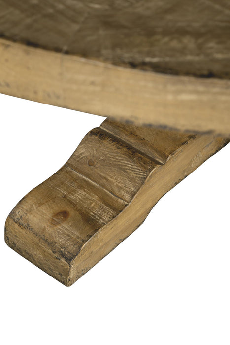 Solid wood dining table with an antique natural finish. Made of reclaimed pine. 72" round and 30" tall. Seat for 6-8 people.
