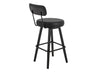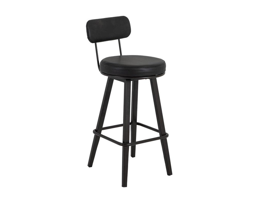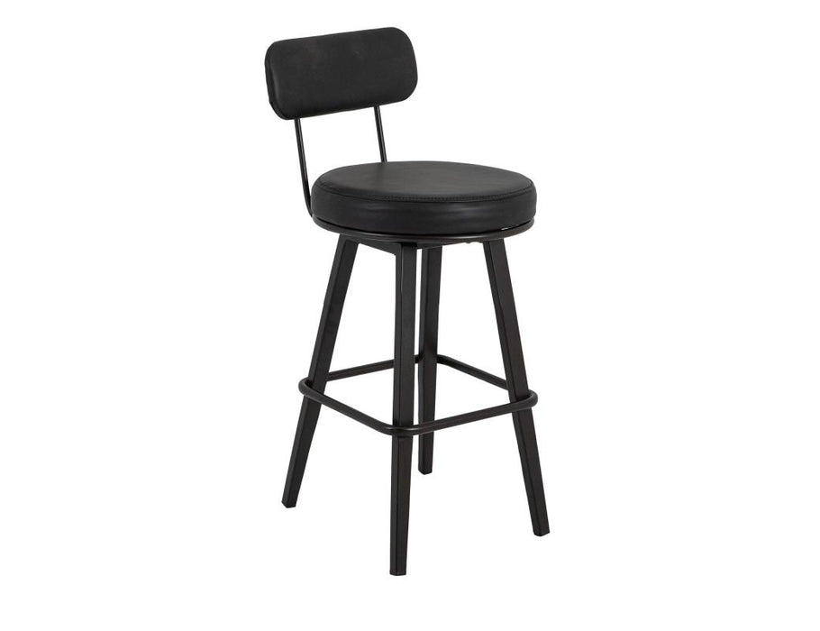 Introducing a sleek and modern eclipse seating collection that combines style with comfort. The stool features a powder-coating metal frame and a black matte finish that resists chipping and ensures long-lasting use. The seat offers superior comfort, upholstered in faux leather. Adding to the overall comfort is the backrest, which features a stylish oval panel in matching black upholstery, supported by two sturdy vertical metal rods that enhance its structural integrity. The cleverly designed legs angle outward for increased stability, while a square metal footrest provides additional support and comfort. This piece is perfect for those seeking functionality and a touch of modern industrial design in their space.