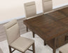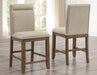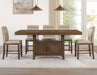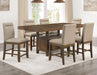 Sophisticated yet relaxed, the Garland Counter Height 5-Piece Dining Set is designed to shine in any space. A distressed toffee finish complements its modern profile, creating a seamless blend of casual elegance. The 36″ counter height table offers a comfortable setting for both dining and standing work, while its faux plank top, enhanced with rasping and threading distressing, adds character and warmth. Paired with four fully upholstered counter chairs featuring tailored canvas covers and brushed brass-tone accents, this set perfectly balances casual and formal elements for an inviting and stylish dining experience. Crafted of oak and acacia veneers; acacia, mango, Asian hardwood solids; and engineered woods