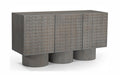 This Oslo 3-Door Credenza features a sleek, modern design with a soft, neutral gray finish. The piece is divided into three spacious compartments, each with a door for concealed storage. At the bottom, it is supported by three elegant pillar-style legs, offering a touch of architectural interest while providing stability. The overall look is minimalist and sophisticated, ideal for contemporary living spaces or offices.