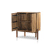 Midcentury styling with a Shaker spirit. Finished in a light, smoked honey, a clean-lined bar cabinetry made from parawood settles into a cradle base of toasted acacia. Plenty of interior space for favorite stemware, with twist-lock metal hardware for a clever finishing touch.