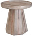 The Zurich Side Table features a sculptural, minimalist design with a round wooden top and a faceted pedestal base. Its weathered finish highlights the natural beauty of the wood, making it a versatile accent piece for any space.